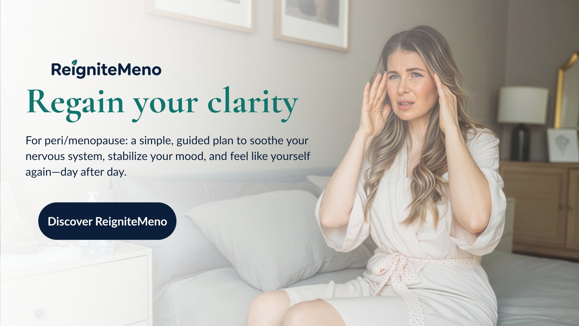 ReigniteMeno is designed for women in perimenopause and menopause who feel “less like themselves” (brain fog, irritability, fatigue, guilt, feeling lost) and who want a simple plan to get back to clarity and balance.